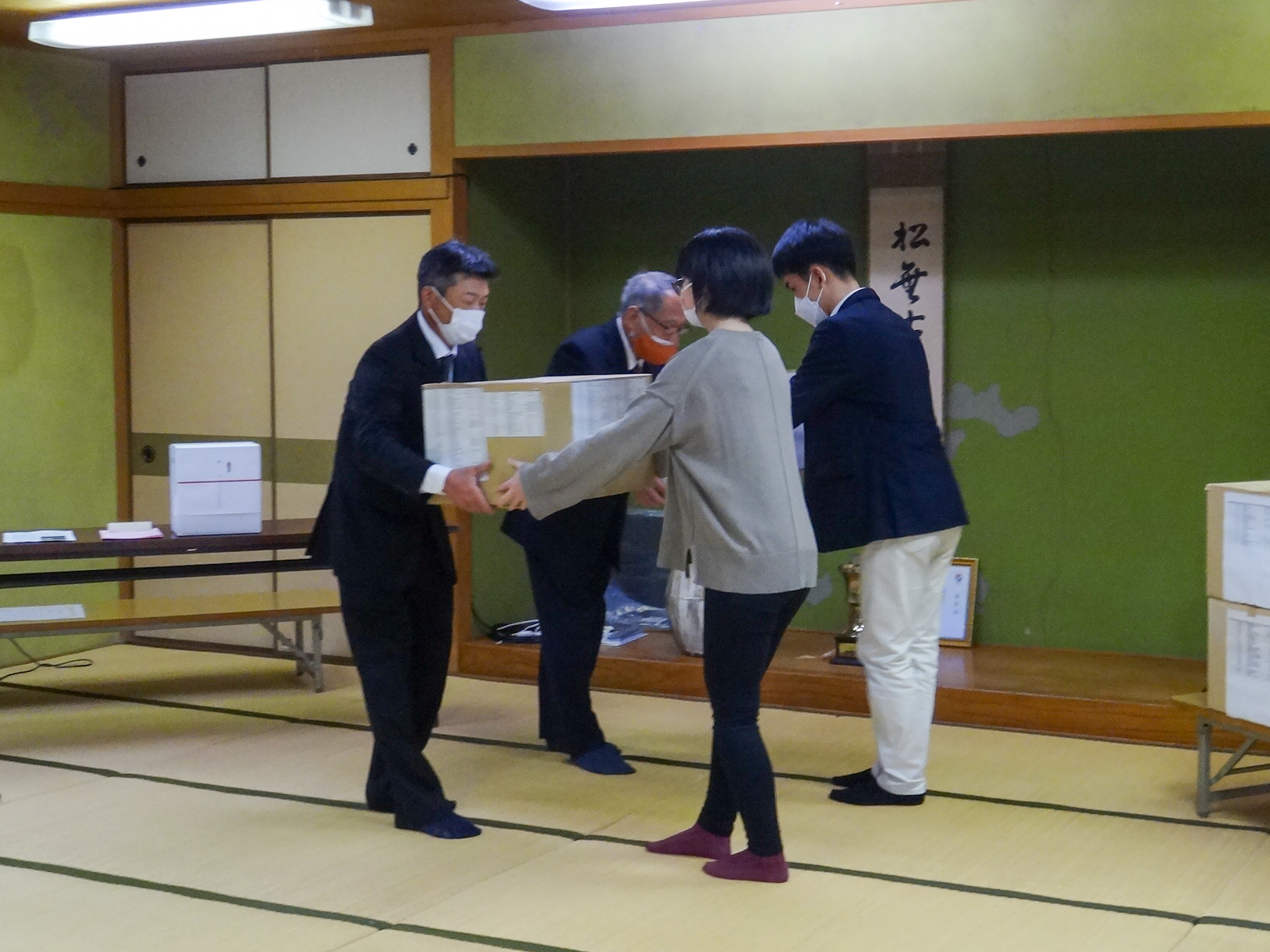 作業に直接携わった人数は、およそ延べ1200人。さらに香川県・徳島県のボランティアの方々からは、利用しやすいよう切断した古新聞を定期的にご寄贈いただきました。愛媛資料ネットと関係各位、また愛媛大学es-BANKの代理として、胡代表と中川事務局長が感謝状を受け取りました。