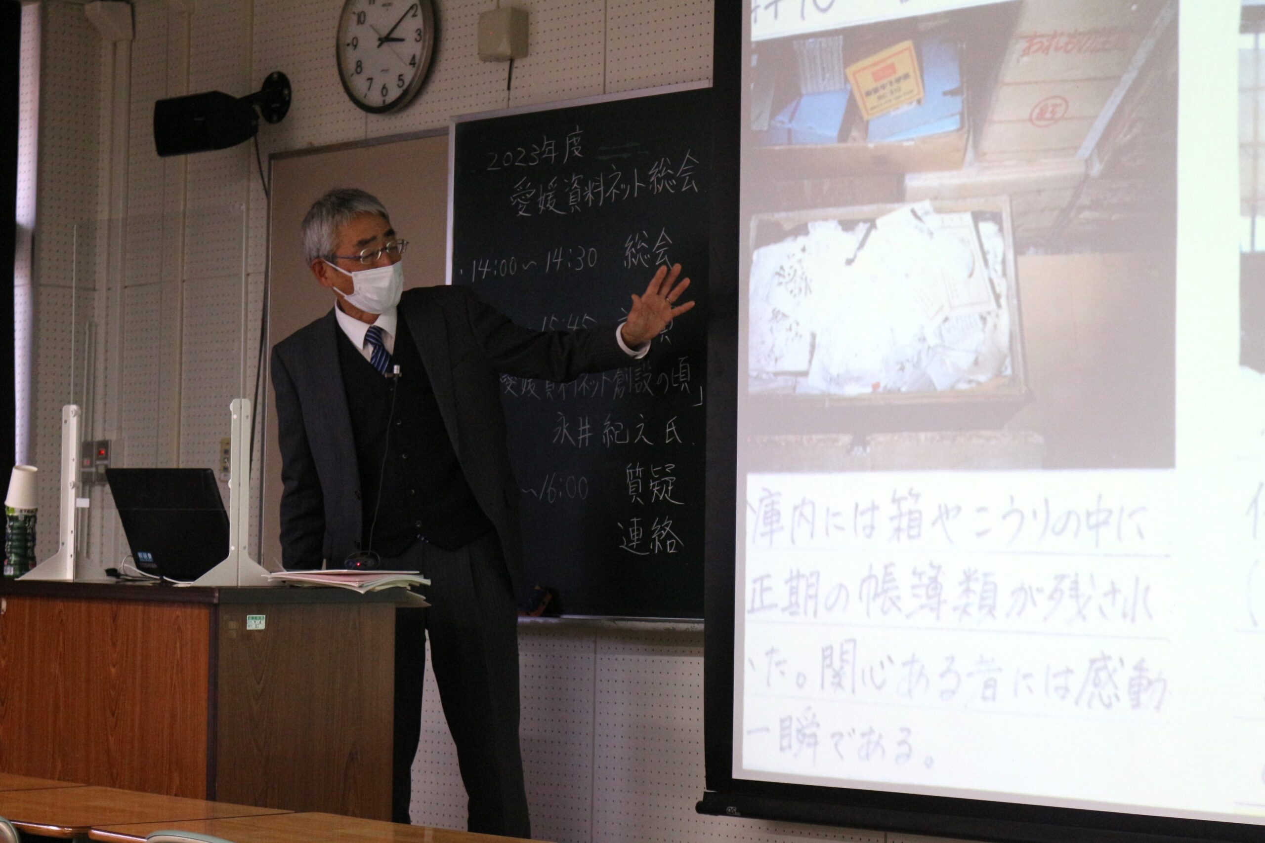 総会では事務局から今年度の予算案、会報の装丁変更、役員の変更などの提案があり、いずれも承認されました。総会後には、本会委員の永井紀之氏の講演がおこなわれ愛媛大学の学生を含む多くの聴講がありました。永井氏は2001年の創設当初の愛媛資料ネットの活動を振り返るとともに、資料救出活動の実情や課題、学校教育における活用の可能性について報告されました。
